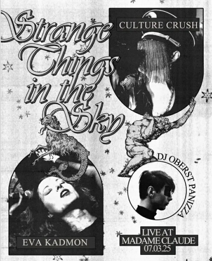 Am 7. März lädt das Berliner Madame Claude zu einem Doppelkonzert mit Eva Kadmon und dem Duo Culture Crush sowie einem DJ-Set. Die Vokalistin, Gitarristin und Soundkünstlerin Eva Kadmon, deren Name an den ursprünglichen Menschen der lurianischen Kabbala erinnert, verbindet je nach Aufnahme eher schleppend-dröhnende oder auch rhythmische Klänge mit okkult inspirierten Subtexten und einem markanten Gesangsstil. Ihre Performances bewegen sich laut Eigenangabe zwischen kryptischer Cold War-Ästhetik und rituellen Anklängen des linkshändigen Pfades. Neben ihren eigenen musikalischen Projekten ist sie auch als Kuratorin der Thunder Perfect-Veranstaltungsreihe aktiv.
