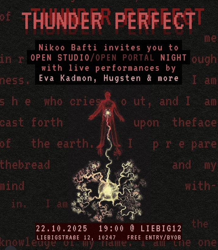 Am Mittwoch, dem 22. Oktober, findet im Studio von Nikoo Bafti in Berlin-Friedrichshain die achte Ausgabe der Veranstaltungsreihe “Thunder Perfect” statt – benannt nach dem berühmten gnostischen Gebet, das neben anderen bereits Current 93, Nurse With Wound und Elijah’s Mantle inspirierte. Die Reihe, kuratiert von der Musikerin und Künstlerin Eva Kadmon, widmet sich seit ihrer Gründung Performances und Klangformen, die zwischen Ritual, Okkultismus und interdisziplinärer Experimentalkunst changieren.