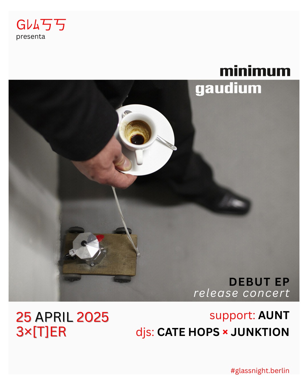 Für Kurzentschlossene: Heute am 25. April 2025, präsentieren Minimum Gaudium und Aunt ihre Debüt-EPs in der von Munsha kuratierten Veranstaltungsreihe GLASS in Berlin-Kreuzberg. Abgerundet wird der Abend durch ein DJ-Set des Turntable-Duos Cate Hops und Junktion. Minimum Gaudium, ein Berliner Trio italienischer Herkunft bestehend aus Luca Canciello (Elektronik), Marco Bianciardi (Drums) und Tiziano Jian (E-Bass), verbinden in ihrer Musik experimentellen Rock, elektronische Texturen und Einflüsse aus Neuer Musik.