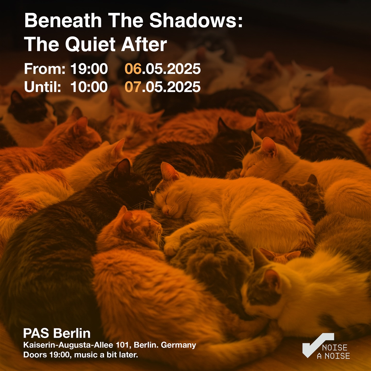 Am Dienstag, den 6. Mai 2025, und somit nur ein Tag nach dem “Confronting Shadows”-Auftakt lädt der Petersburg Art Space in Berlin-Moabit zu einem nächtlichen Konzert ein, das sich bewusst an der Schwelle zwischen Wachsein und Schlaf bewegt. Unter dem Titel “Beneath The Shadows: The Quiet After” versammelt sich eine vielfältige Gruppe musikalischer Acts, um ein durchgehendes, dreizehnstündiges Set ambienter, droniger und experimenteller Musik zu gestalten, organisiert von Soheil Soheili. Das sogenannte Schlafkonzert ist eine besondere Form des Musikhörens, bei der das Publikum die gesamte Nacht liegend verbringt. In der Tradition der Arbeiten des US-amerikanischen Musikers und Schlafforschers Robert Rich, der mit seinen “Sleep Concerts” in den 1980er-Jahren ein neues Format zwischen Kunst und Bewusstseinsforschung etablierte, bewegt sich auch dieser Abend jenseits konventioneller Konzertstrukturen. Es geht nicht um das passive Hören einzelner Stücke, sondern um ein tiefes Eintauchen in einen Zustand zwischen Wachheit und Schlaf, im besten Fall um ein Schweben im hypnagogen Raum, in dem äußere Klänge mit inneren Bildern und assoziativem Denken verschmelzen. Der Eintritt erfolgt auf Spendenbasis (empfohlen ab 8 €). Mann sollte Decken, Isomatten oder Schlafsäcke mitbringen.