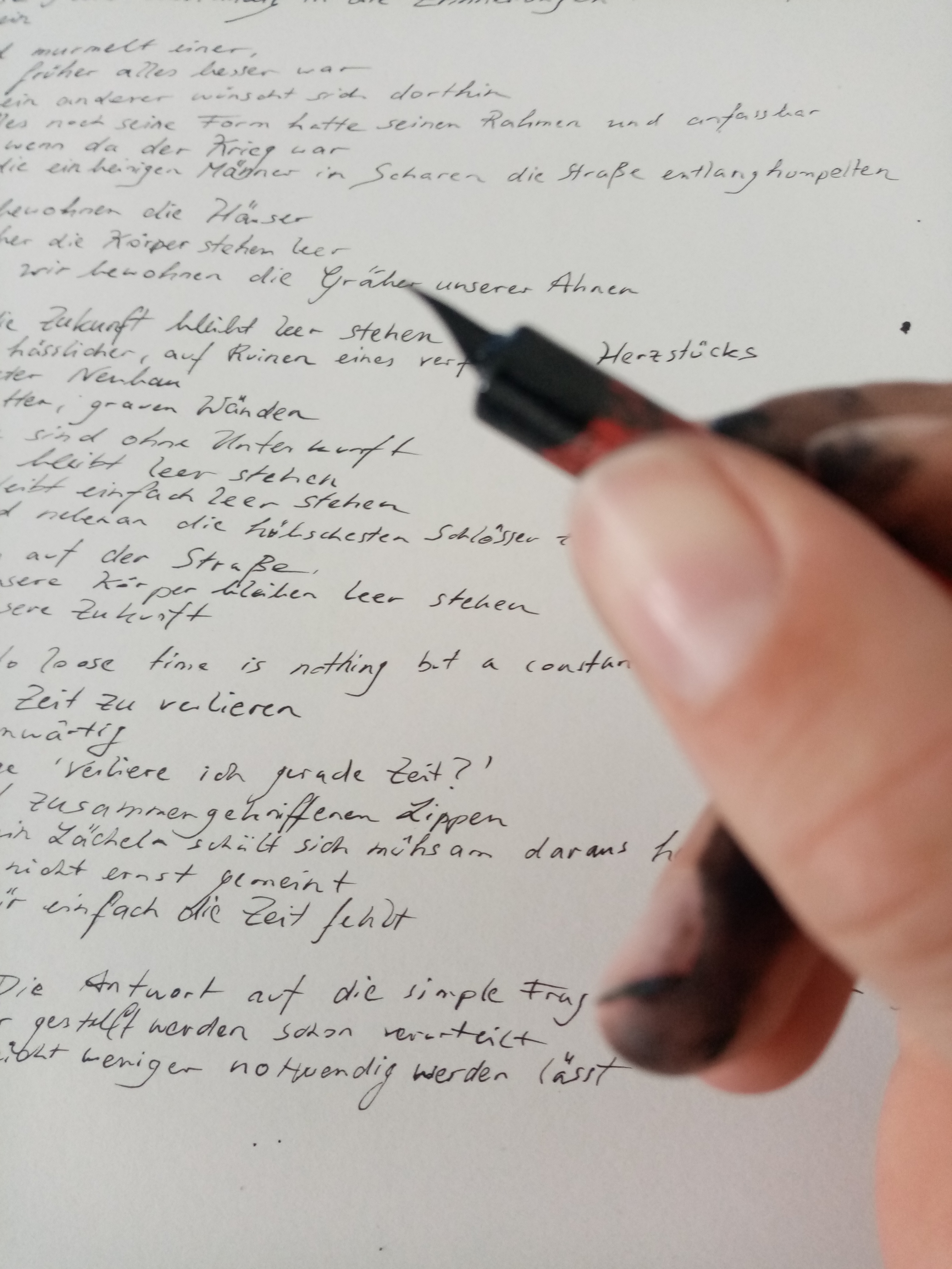 Ich sehe mich nicht. Also nur Teile von mir. Ich bin und ich schreibe. Viel und schon seit vielen Jahren, es stapelt Seiten, tausende. Ich komme eher vom Schreiben als von der Musik, die geschriebene Sprache ist für mich vielleicht der Kitt der die Welt zusammenhält, eben die physische und die ideelle. Ich fülle Notizbuch um Notizbuch, ich habe in der Vergangenheit oft bei Lesungen mitgewirkt, ich habe nie ein Buch veröffentlicht, da ich nie die Zeit hatte, nach einem Verlag zu suchen. Projekt für 1.10 – 30.3, endlich das Manuskript zusammenführen und abschicken (Kurzgeschichten, lyrische Prosa, abstrakt, ohne Namen und Orte, stattdessen: Bedeutungszusammenhänge, ein Du, ein Ich). Die Zweifel stehen dummdreist im Weg rum, so wie der Widerwille gegenüber allem, das mit Verwertungslogik zu tun hat.