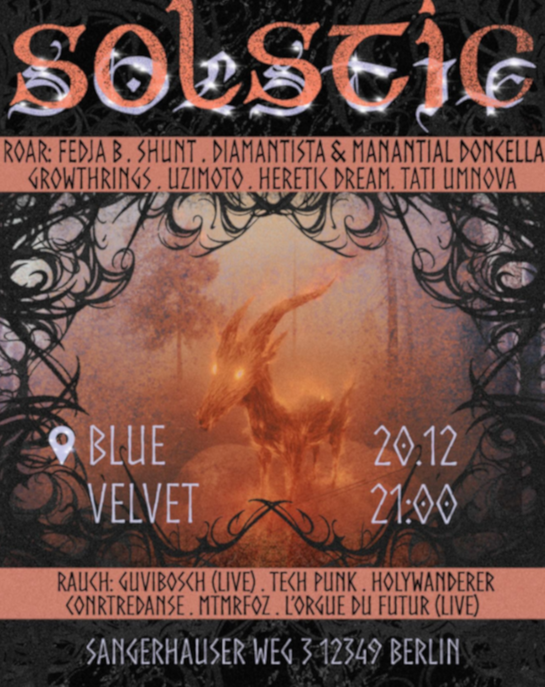 Am 20.12. findet mit “Solstic” ein Konzertabend in Berlin nahe der Britzer Gärten statt. Auf dem Programm stehen auf ganz unterschiedliche Weise experimentierfreudige Acts wie Fedja B., growthrings, L’orgue Du Futur, SHUNT, manantial_doncella & Diamantista mit einer Live-Performance sowie