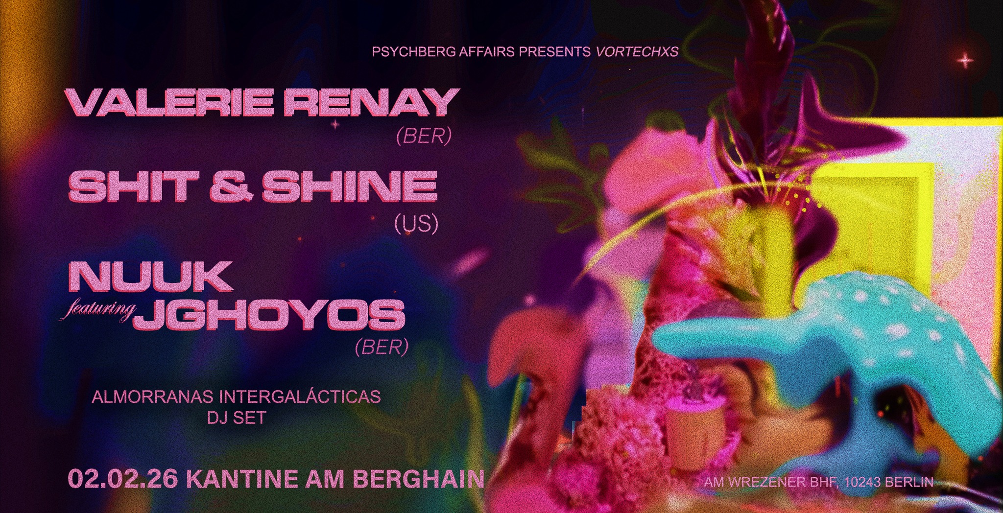 Am Montag, dem 2. Februar, findet in der Berliner Kantine am Berghain eine neue Folge der Reihe VORTECHXS statt, präsentiert von Psychberg Affairs, mit Konzerten von Shit & Shine, Valerie Renay sowie NUUK feat. JGHoyos. Shit & Shine ist ein seit 2004 bestehendes Projekt aus Austin, Texas, gegründet seinerzeit von Craig Clouse.