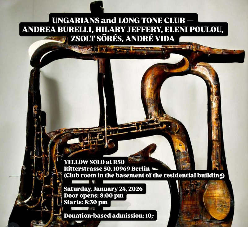 Im Berliner Venue R50 findet heute ein Konzertabend mit zwei Performances statt. Präsentiert von Yellow Solo, treten die Projekte Ungarians und Long Tone Club gemeinsam auf. Ungarians ist das Duo von Zsolt Sőrės und André Vida. In ihrer Arbeit befassen sie sich mit gemeinsamen kulturellen Prägungen u.a. in Budapest und Berlin und deren klanglichen Spuren.