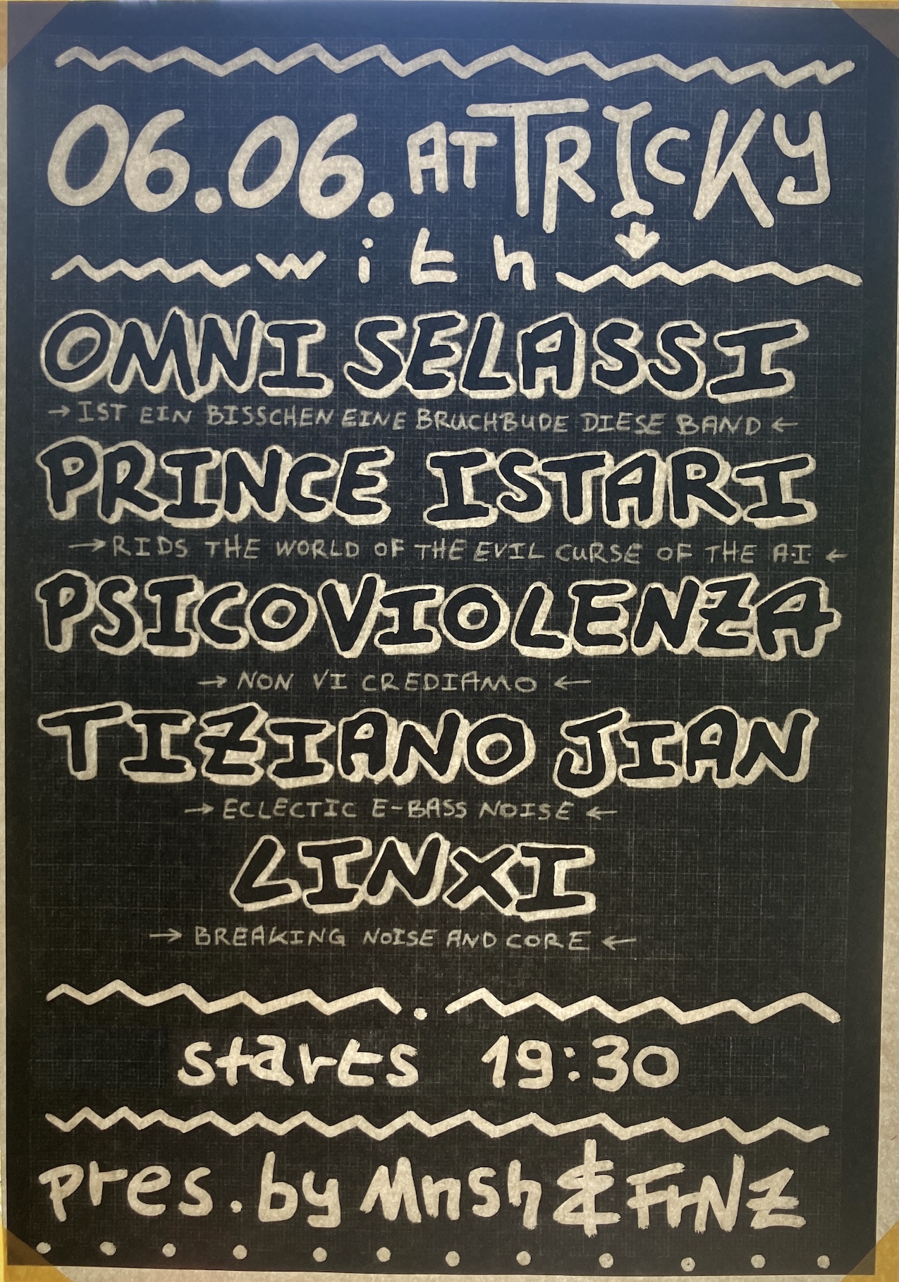 Am Freitag, den 6. Juni, findet in Berlin-Kreuzberg ein Konzertabend mit internationalen Gästen statt, deren Arbeiten in den Grenzbereichen experimenteller Elektronik angesiedelt sind. Es geht, wie es in der Ankündigung heißt, um Lärm, Bass, Improvisation, unerwartete Kontraste und das bewusste Ineinanderfließen unterschiedlichster Formen. Mit dabei sind Omni Selassi aus Bern, Prince Istari aus Hamburg, PsicoViolenza aus Neapel sowie die Berliner Acts Tiziano Jian und Linxi.