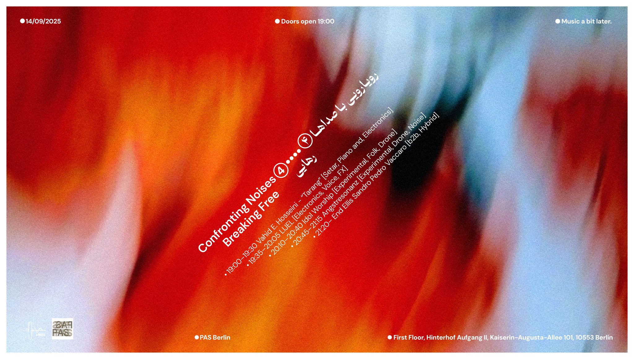 Am Donnerstag den 18. September setzt die von Soheil Soheili und aNoise kuratierte Reihe “Confronting Noises” im Petersburg Art Space ihre Erkundungen zwischen zeitgenössischer und experimentell-elektronischer Musik fort. Der vierte Teil bringt unter dem Motto “Breaking Free” unterschiedliche Ansätze von Improvisation, Drone, Noise und hybriden Formen zusammen. Der in Teheran geborene und in Berlin lebende Komponist und Performer Vahid E. Hosseini arbeitet an der Schnittstelle von persischen und westlichen Traditionen und verhandelt in seinen Stücken die Spannungen zwischen beiden. Mit Setar, Klavier und Elektronik verbindet er historische Prägungen mit zeitgenössischen Klangsprachen.