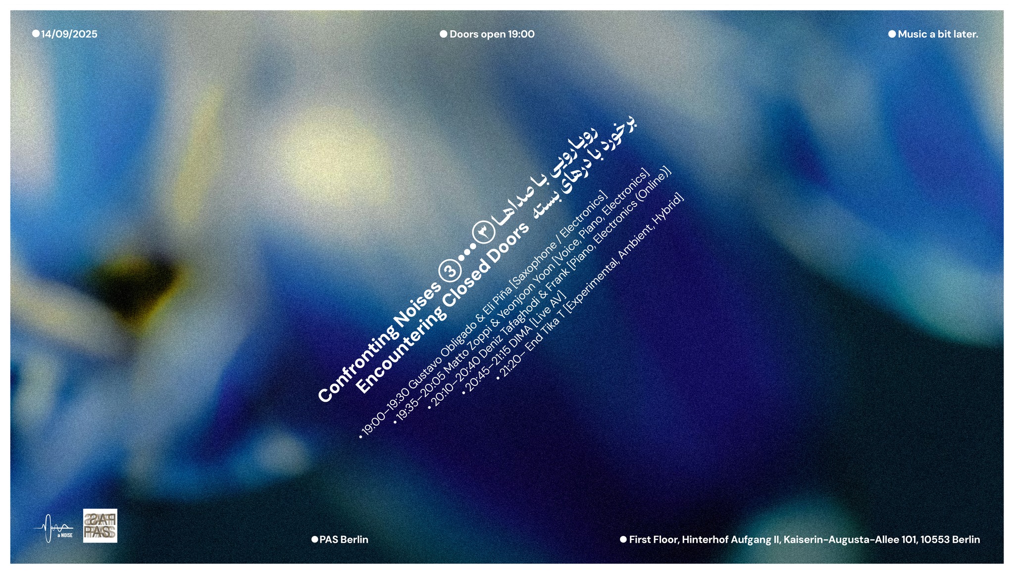 Soheil Soheili und aNoise, f.k.a. Noise a Noise, laden zur dritten Ausgabe der Konzertreihe “Confronting Noises” ins Berliner Petersburg Art Space. Der Abend steht unter dem Untertitel “Encountering Closed Doors” und widmet sich aktuellen Strömungen zwischen Improvisation, Noise und hybriden Formen experimentierfreudiger Musik.