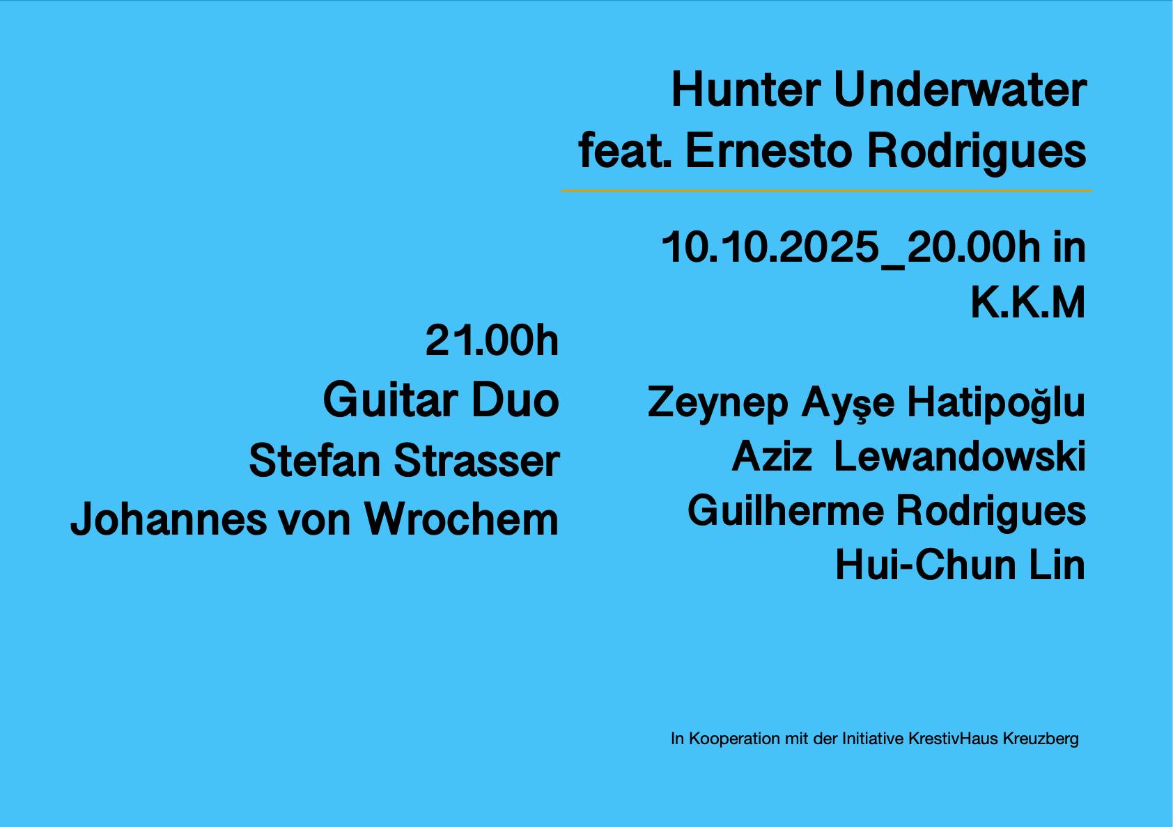 Am Freitag, den 10. Oktober, findet in Berlin-Kreuzberg im Rahmen der Ausstellung “No Facts” im Kiezraum auf dem Dragonale ein Doppelkonzert statt. Der Abend beginnt um 20 Uhr mit Hunter Underwater, die zusammen mit Ernesto Rodrigues ein Celloquartett präsentieren.
