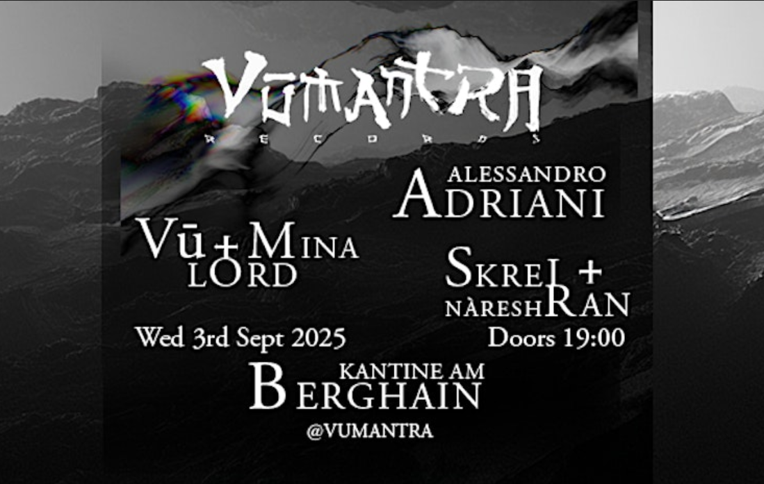 In der Kantine am Berghain trifft am kommenden Mittwoche dem 3. September kompromisslose elektronische Avantgarde auf ebenso kompromisslose rohe Energie. Gastgeber ist das Berliner Label Vūmantra Records, gegründet von Vince Gagliardi alias Vū alias The Nent, das sich experimentellen und rituell aufgeladenen Formen elektronischer Musik verschrieben hat.