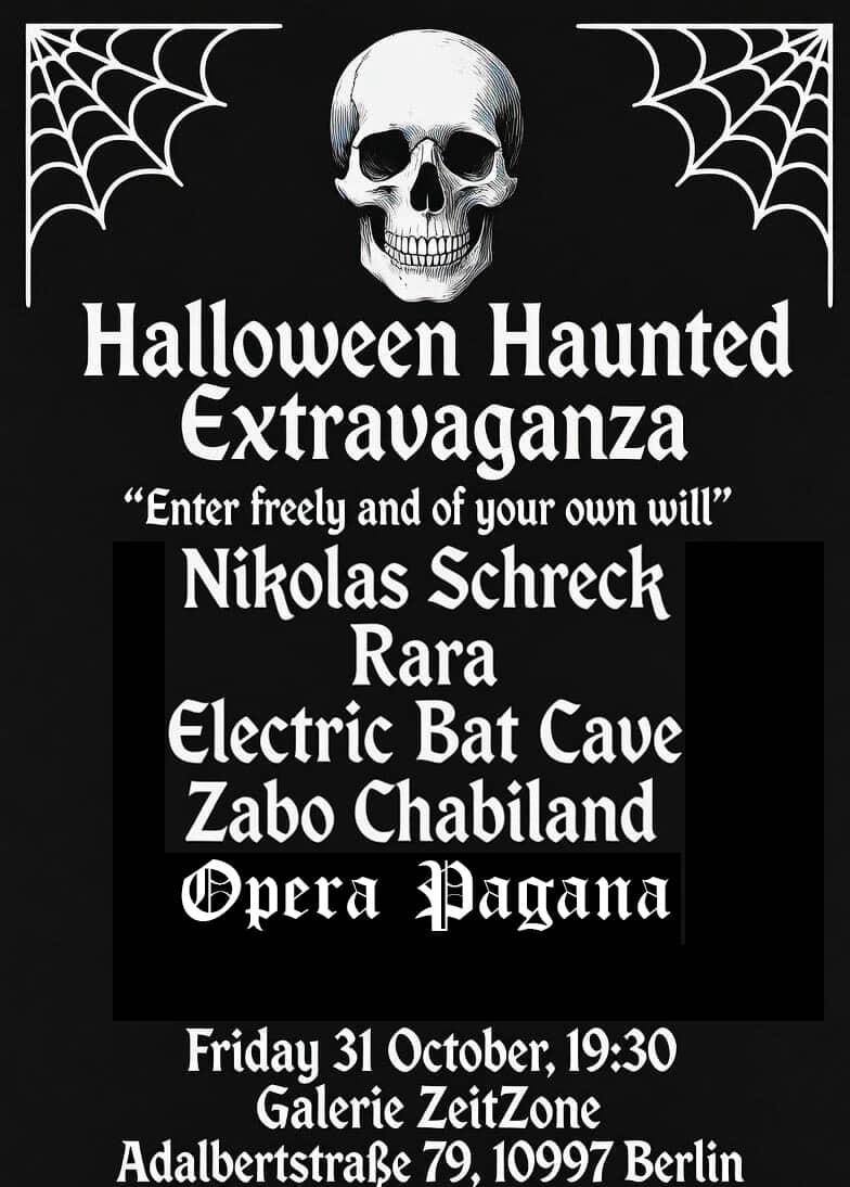Am 31. Oktober verwandelt sich die Galerie Zeitzone in Berlin in einen Ort zwischen Schatten und Bühne, zwischen Musik, Performance und Fantastik im Zeichen der Tradition des Halloween unter dem Titel “Halloween Haunted Extravaganza”.