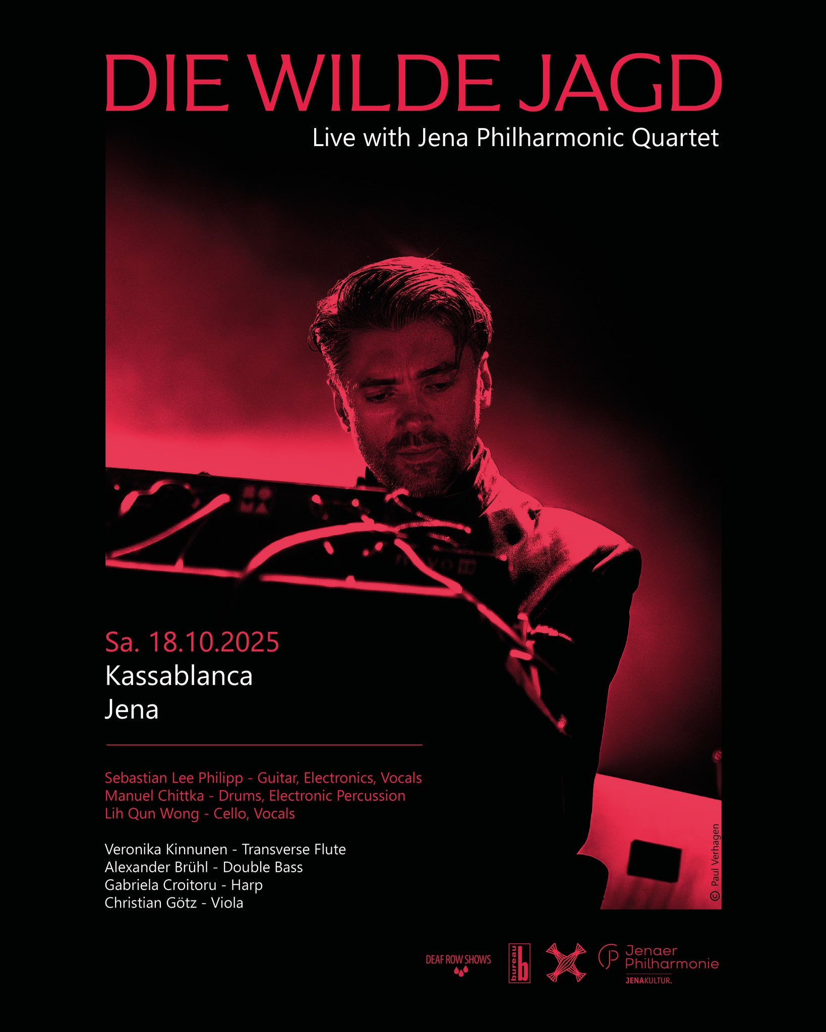 Die Wilde Jagd kommt im November für ein besonderes Konzert nach Jena: Gemeinsam mit einem Quartett der Jenaer Philharmonie präsentiert das Projekt von Sebastian Lee Philipp im Kassablanca ein Programm, das Stücke aus mehreren Alben vereint. Die Besetzung bringt dabei ein spannendes Zusammenspiel aus Band und klassischem Ensemble auf die Bühne. Neben Philipp an Gitarre, Elektronik und Gesang stehen Schlagzeuger Manuel Chittka sowie die Cellistin und Sängerin Lih Qun Wong. Ergänzt wird das Trio durch Veronika Kinnunen (Querflöte), Alexander Brühl (Kontrabass), Gabriela Croitoru (Harfe) und Christian Götz (Viola).